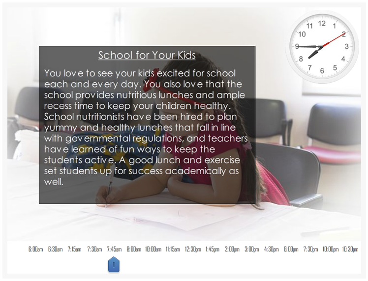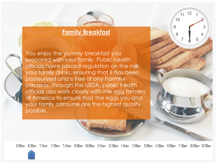 This learning object was created to supplement an Introductory Public Health and Principals course.  In the previous lesson, students learn why public health matters to their day to day activities. The students will slide the slider to walk through someone`s daily life, viewing how public health initiatives and actions play a role in ensuring their and their family`s health and wellbeing in different times of a day.